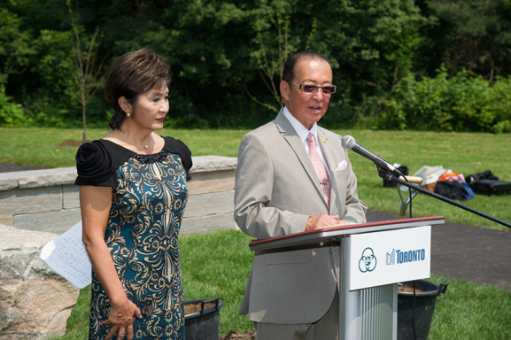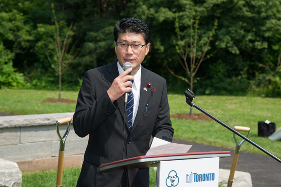 On July 6, a Sakura (Japanese flowering cherry) tree was planted in a special ceremony in Birkdale Ravine in Scarborough, symbolizing the friendship agreement between Toronto and the City of Sagamihara in Kanagawa Prefecture. In attendance were Consul-General of Japan Yasunori Nakayama, Deputy Mayor of Sagamihara Hiroaki Koike, Sagamihara Council Chair Yoshihiro Abe, representatives of the Sagamihara Chamber of Commerce and Industry as well as Mr. James Matsumoto and Ms. Chako Setoyama of Toronto who had been appointed special advisor by the City of Sagamihara. Representing Toronto were Toronto City Councillor Michael Thompson, Councillor Chin Lee, members of the Japanese community and local residents. About 100 people took part in celebrating the continuation and development of the friendship between the municipalities.