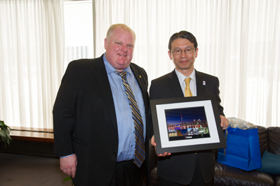 Consul General of Japan Eiji Yamamoto visited Toronto City Hall on April 22 to pay a courtesy call on Mayor Rob Ford. A fruitful discussion took place, running longer than had been scheduled, centering on further strengthening economic ties and increasing cultural exchange between Japan and Toronto, which recently had been designated the fourth largest city in North America.