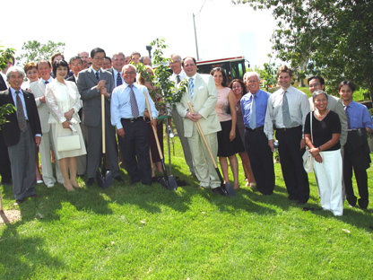 Consul-General and Sakura Committee Chair Koichi Kawakami (right) along with Toronto Deputy Mayor Joe Pantalone (left) and TEDCO President Jeffrey Steiner plant a Sakura sapling on Cherry Street in Toronto's waterfront area.