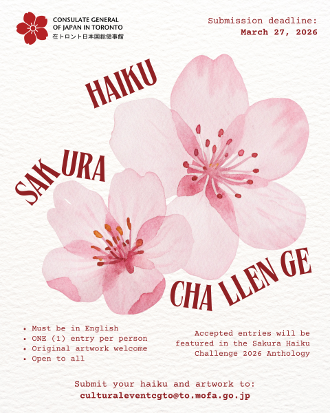 The Consulate-General of Japan in Toronto is proud to announce the opening of our 4th annual Sakura Haiku Challenge. We are now accepting submissions under the theme, “Sakura” (Japanese cherry blossoms).