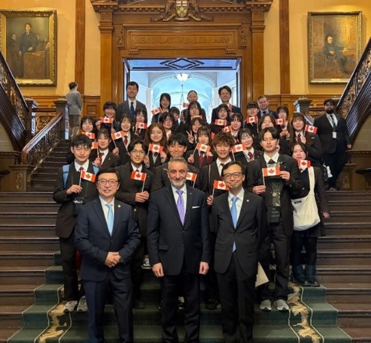 On March 25, Consul-General Matsunaga, together with students and teachers from Tokyo Metropolitan Hachioji Higashi Senior High School who were visiting Toronto, visited the Legislative Assembly of Ontario and met with Honourable Paul Calandra, Minister of Education, and Mr. Billy Pang, Parliamentary Assistant to the Minister of Education. The students received a briefing on educational policies and the provincial legislature in Ontario and toured the historic provincial legislature building.