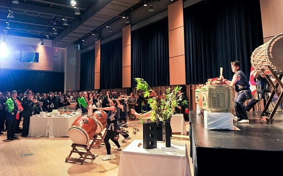 On July 20, Consul-General of Japan Takako Ito and her husband, Mr. Claude Ito, hosted a reception at the Japanese Canadian Cultural Centre (JCCC) in celebration of the 90th anniversary of Japan-Canada diplomatic relations. In attendance were approximately 400 guests, including local politicians, business people, members of the cultural community, local Japanese nationals and Japanese Canadians, representatives of the Japanese business community, alumni of the Japan Exchange and Teaching (JET) Programme and of the MEXT Japanese Government Scholarships, representatives of the local consular corps and others. A powerful performance by the JCCC’s taiko club, Kyowa Taiko, opened the evening, followed by the national anthems of Japan and Canada, remarks by Consul-General Ito and special guests, a ceremonial saké barrel opening called kagamiwari and a toast. Also as part of the evening, an awards ceremony was held for the winners of the “Japan, Canada and Me” Photo Contest, organized by the Consulate-General of Japan from May 12 to July 8.