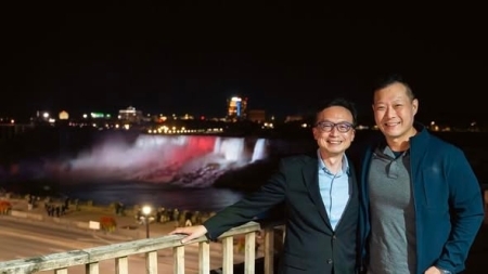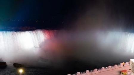ナイアガラ観光の振興 令和7年10月30日 10月14~15日 松永総領事はスタン・チョー・オンタリオ州観光文化賭博大臣の招きによりナイアガラ地域を訪れました。ナイアガラ滝の他、ワイン生産、劇場文化、歴史遺産等、日本人観光客にとって魅力的な同地域の豊かな観光資源についての認識を深める有益な機会となりました。 ナイアガラの滝に投影された日の丸