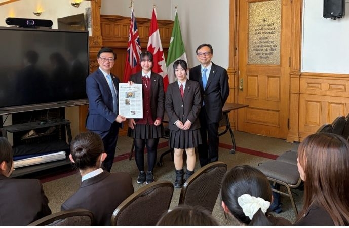 3月25日、松永総領事は、トロントを訪問中の東京都立八王子東高校の教員及び生徒一行と共にオンタリオ州議事堂を訪問し、ポール・カランドラ・オンタリオ州教育大臣及びビリー・パン同副大臣と面会しました。この機会に生徒たちはオンタリオ州の教育や州議会について説明を受けるとともに、歴史ある州議事堂を見学しました。