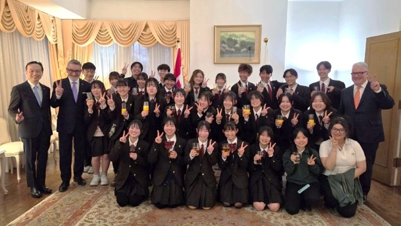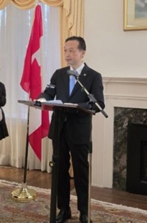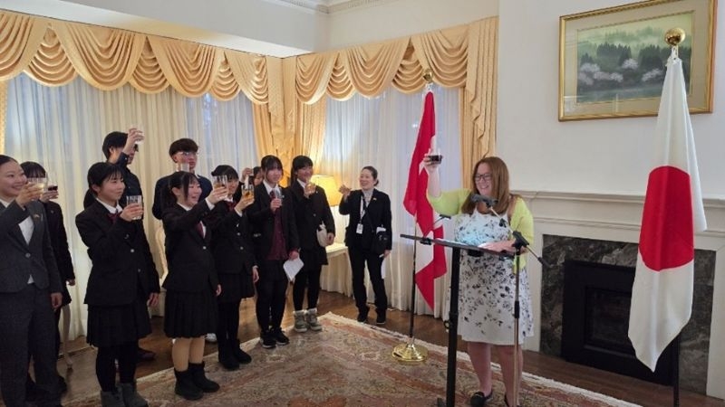 加えて同日、松永総領事は、公邸にて歓迎レセプションを開催し、八王子東高校が教育交流を行うC. W. ジェフリーズ高校、セント・ロバート・カトリック高校、トロント大学マンク国際問題研究所など多くの教育機関の関係者に出席していただきました。本レセプションには、カランドラ教育大臣にご出席いただき、同大臣より、この訪問がオンタリオ州と日本の生徒たちが互いの文化への理解を深められる機会となることを願っている旨、激励の言葉をいただきました。また、キース・アイリッシュ・マーカム市第一区市議会議員及びステイシー・ザッカー・トロント地区教育委員会教育部長代理より、生徒たちへの激励と今後のパートナーシップ発展への期待を述べていただきました。本レセプションでは、八王子東高校の生徒代表から抱負が述べられるとともに、参加者たちは今後の交流促進等について活発な意見交換を行いました。