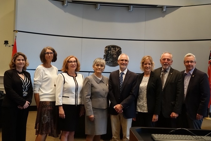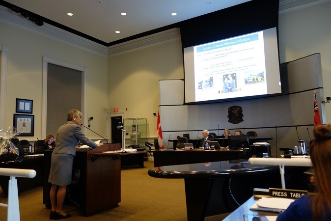 9月23日、伊藤総領事はクラリントン市を訪問し,同市市議会にてエイドリアン・フォスター市長及び市議会議員ほか約40名に対して、日加関係についての講演を行ったほか、キム・ラッド前連邦政府天然資源担当政務官、デビッド・ピチニ・オンタリオ州訓練・大学教育担当政務官と懇談しました。このほか、同市ニューキャッスル地区から都市間交流「世界ニューキャッスル・サミット」の一環として昨年、愛知県新城市を訪れた訪問団との面会やニューキャッスル地区コミュニティーホールでのモミジの植樹を行いました。