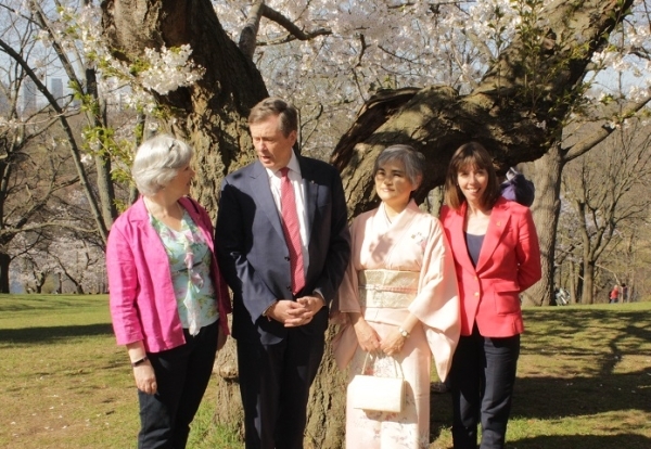 8日朝、間もなく満開を迎えるハイパークの桜についてトロント市が記者会見を行い、トーリー市長、ハイパークを選挙区に持つデュセット市議会議員、トロント市公園・環境委員会委員長であるマクマーン市議会議員と共に、伊藤総領事が桜色の着物姿で出席し、挨拶を述べました。